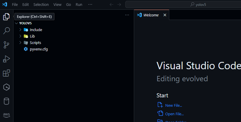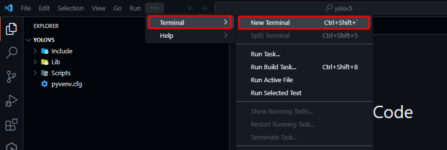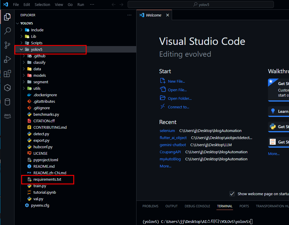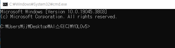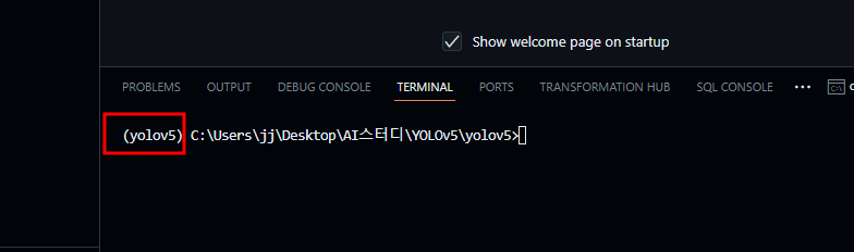 실행 터미널 앞쪽에 (yolov5)라는 우리가 venv를 설정했을때 지정한 이름이 나온다.