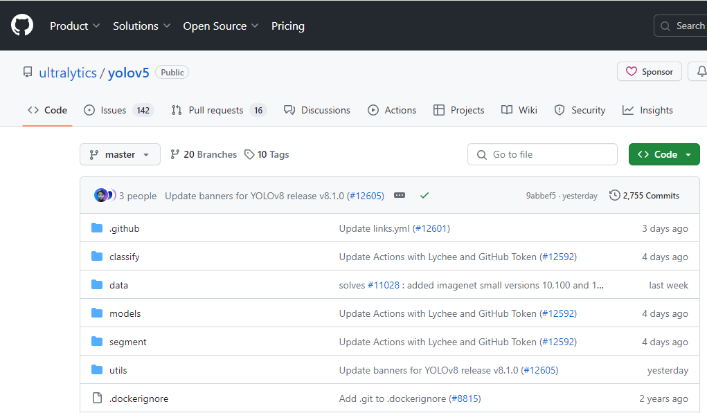 먼저 https://github.com/ultralytics/yolov5 사이트에 방문하여 다운로드를 진행하자.