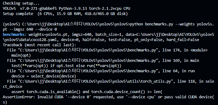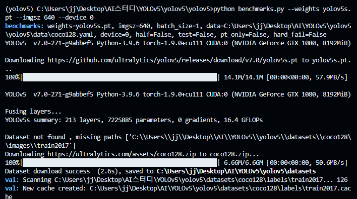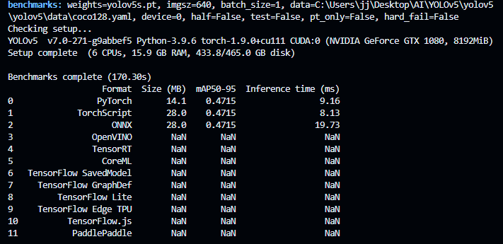 benchmarks: weights=yolov5s.pt, imgsz=640, batch_size=1, data=C:\Users\jj\Desktop\AI\YOLOv5\yolov5\yolov5\data\coco128.yaml, device=0, half=False, test=False, pt_only=False, hard_fail=False