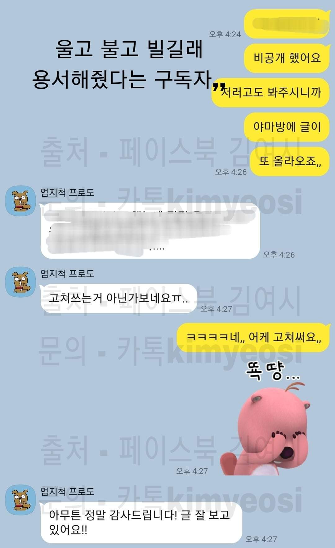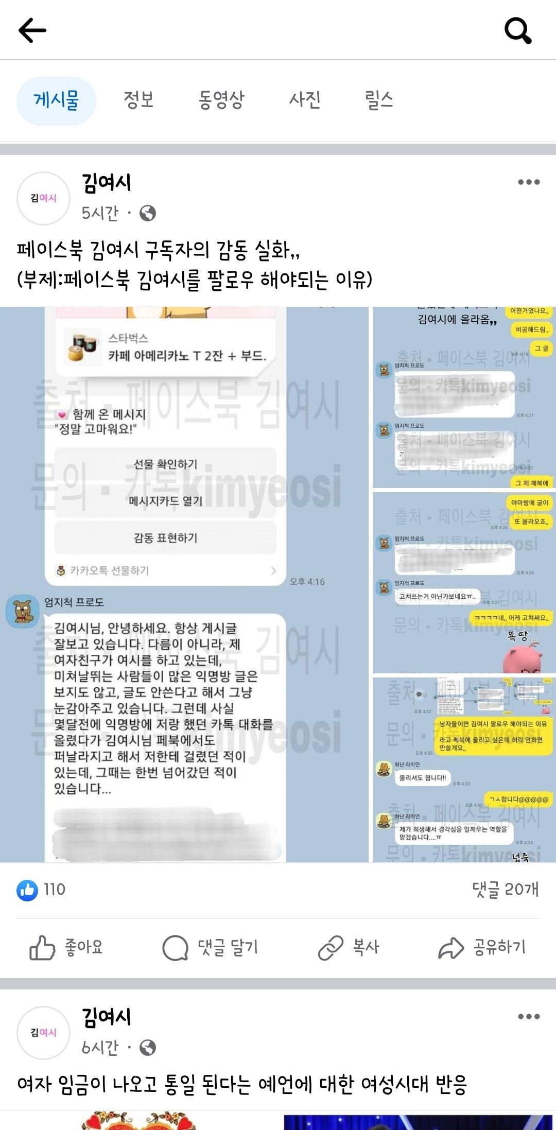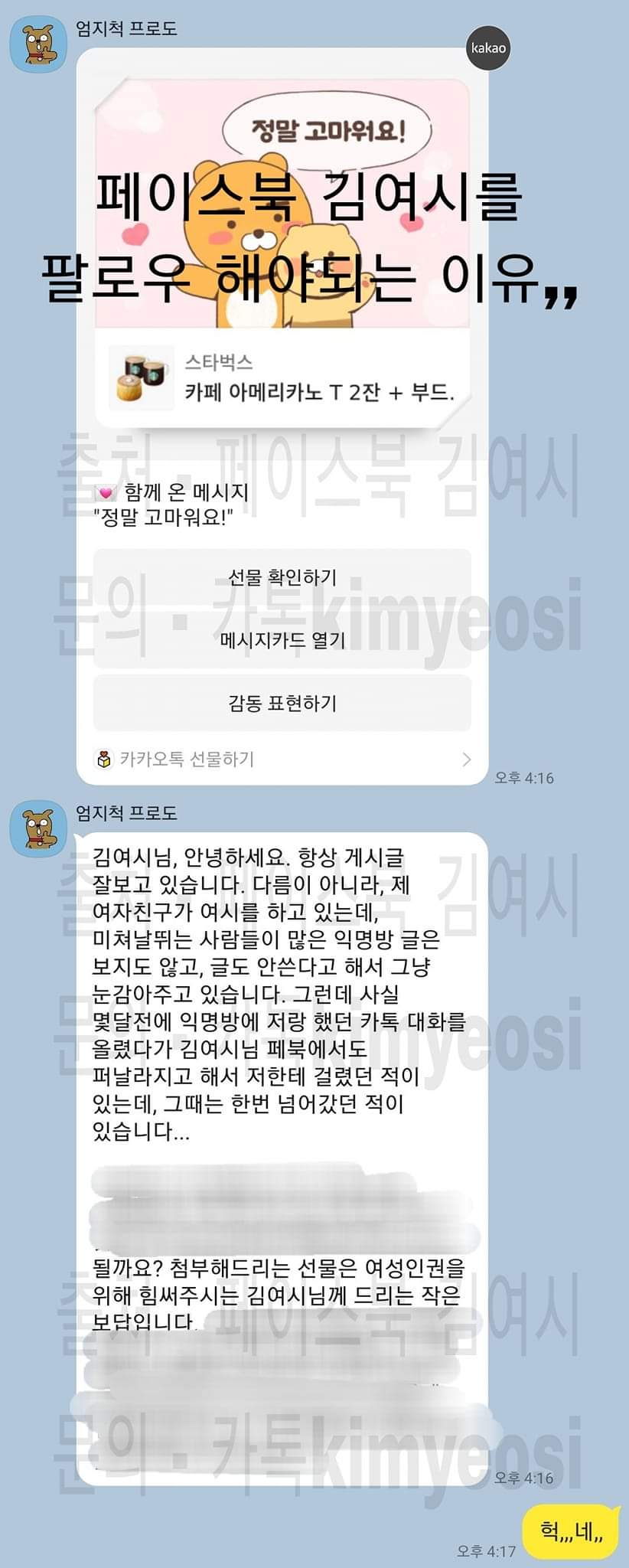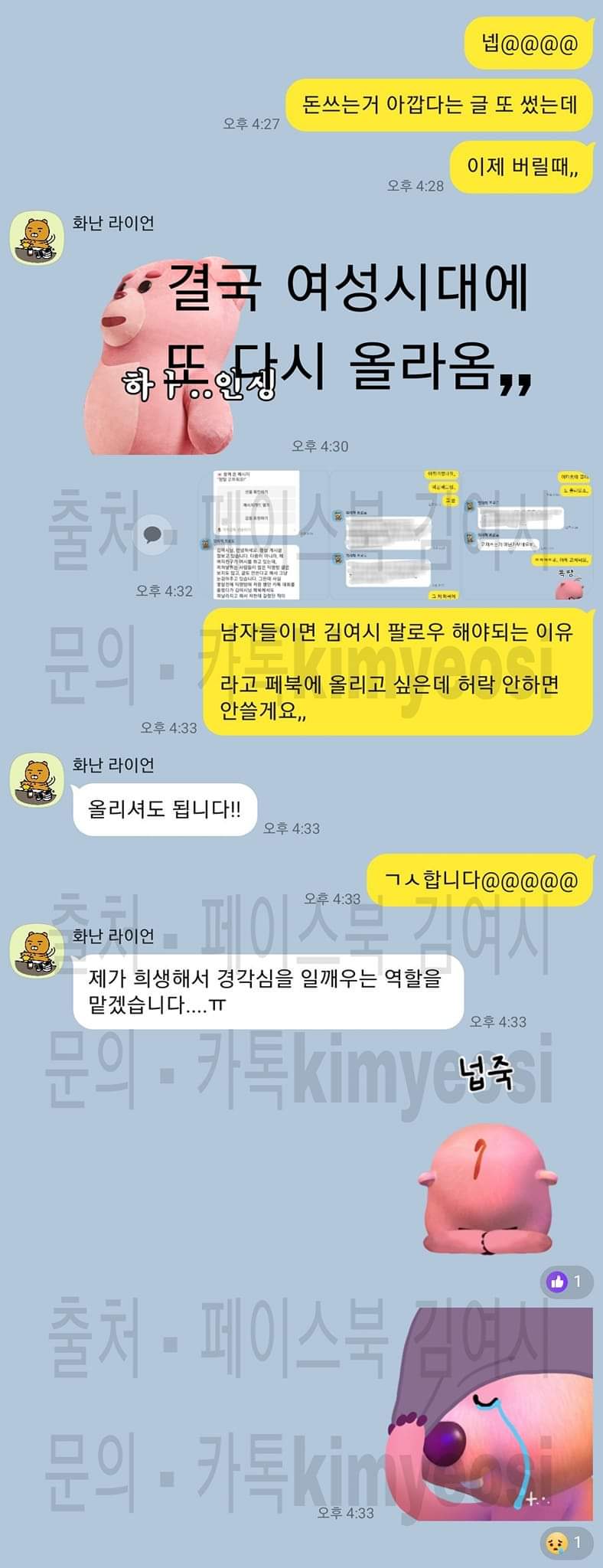 몇달전 여친이 여성시대에 카톡 대화 올린걸 김여시가 퍼갔었는데 울면서 용서 비는거땜에 봐줬더니 오늘 또 올라왔다함ㅋㅋㅋㅋㅋ
